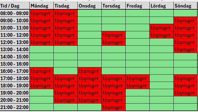 Se nedan översikt över lediga tider, kontakta oss för att boka tid, samma gäller om Ni vill boka klubbstugan för evenemang. Betala gärna via Swich, Nummer: 123 324 2831 Ange: Uthyrning